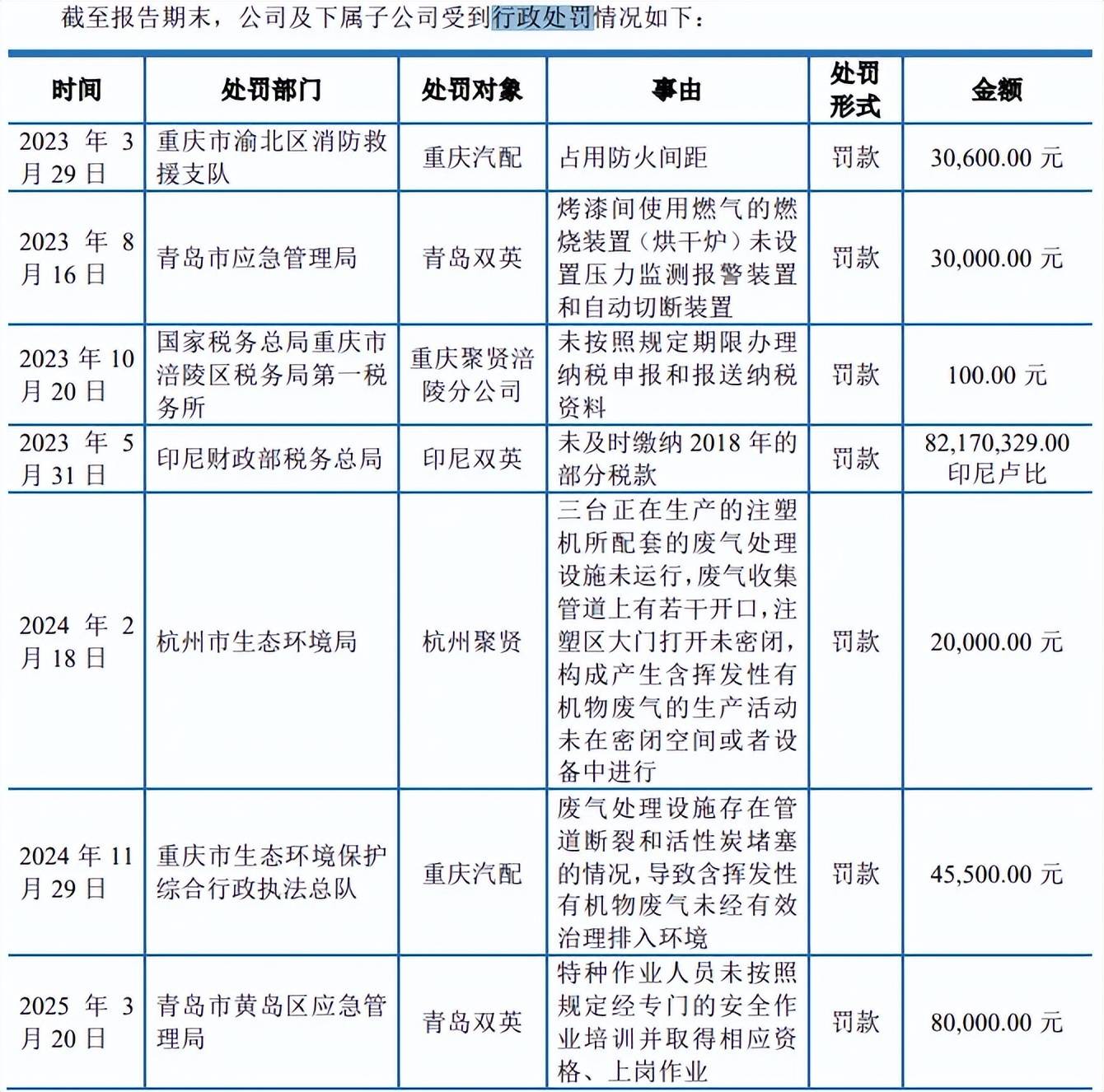 多家子公司遭遇罚单。报告期内,双英集团多家子公司遭遇行政处罚,处罚类型涉及消防、安全生产、税收、环保等,2023年3月,重庆汽配因占用防火间距被罚款30,600元;5月,印尼双英因未及时缴纳2018年的部分税款被罚款82,170,329.00印尼卢比;8月,青岛双英因烤漆间使用燃气的燃烧装置(烘干炉)未设置压力监测报警装置和自动切断装置被罚款30,000元;10月,重庆聚贤涪陵分公司因未按照规定期限办理纳税申报和报送纳税资料被罚款100元。
