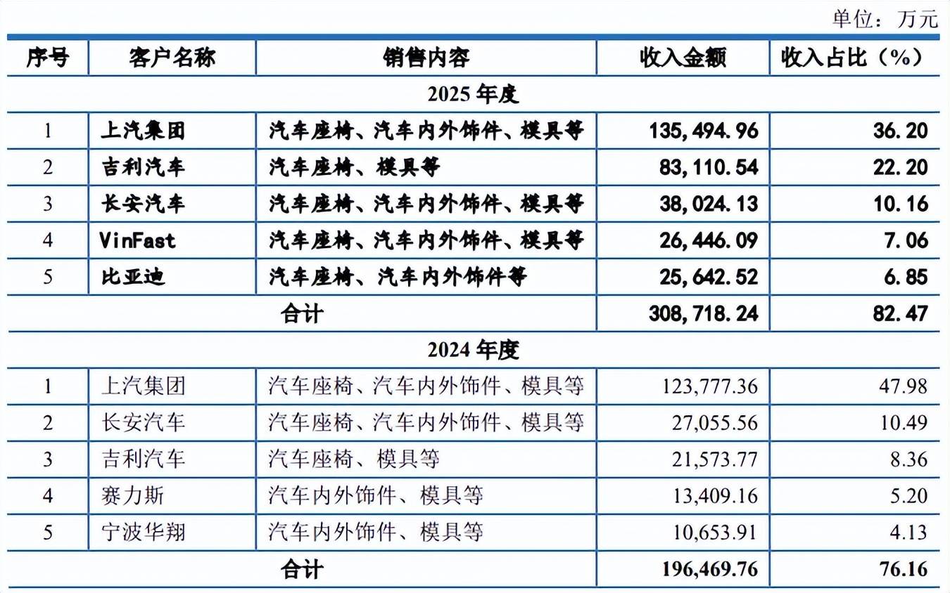 事实上,公司客户集中度较高,对前五大客户的销售额分别为18.25亿元、19.65亿元、30.87亿元,占比分别为82.78%、76.16%、82.47%,客户包括上汽集团、吉利汽车、长安汽车、VinFast、比亚迪,其中上汽集团一直是第一大客户,销售额分别为12.21亿元、12.38亿元、13.55亿元,占比分别为55.38%、47.98%、36.2%。