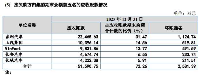 报告期内,公司应收账款余额保持在高位,分别为7.13亿元、7.77亿元、7.14亿元,同时期坏账准备分别为7,068.62万元、7,964.64万元、4,309.71万元,期末应收账款主要集中吉利汽车、上汽集团、VinFast、长安汽车、长城汽车,合计51,590.75万元,占比72.26%,其中吉利汽车应收账款、占比分别为22,465.63万元、31.47%。