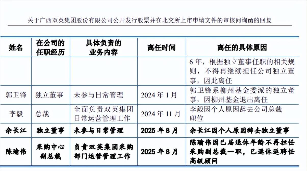 高层变动大,总裁辞职。双英集团高层调整较大,2023年12月,董事李双霞、廖博川因柳州基金退出离任;2024年1月,独立董事王震坡因连任六年离任;2024年1月,独立董事郭卫锋因柳州基金退出离任;2025年8月,独立董事余长江因个人原因辞职。