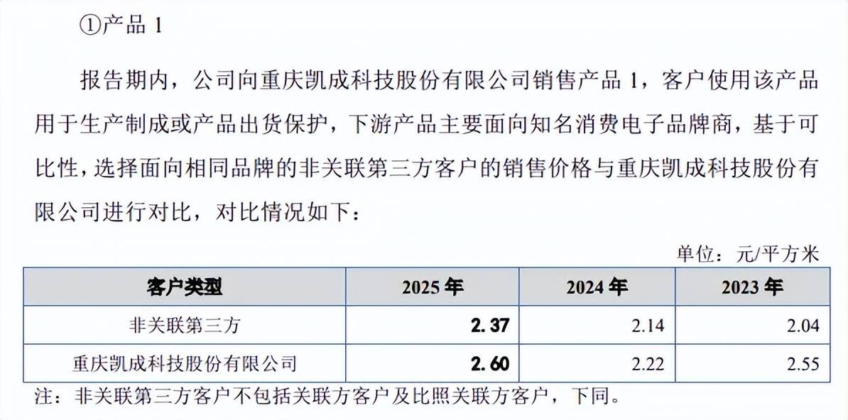 据问询函,公司向凯成科技销售的商品主要为产品1、产品2和产品3,报告期内产品1的销售均价分别为2.55元、2.22元、2.6元,向非关联第三方的销售均价分别为2.04元、2.14元、2.37元,公司称2023年高于同类型非关联第三方客户,主要系该客户2023年购买的该产品厚度较厚,厚度在100um以上的该产品占比较高,导致成本和价格较高,那么2024年、2025年该产品销售价格高于非关联第三方又是什么原因?该情况需要引起北交所重点关注。