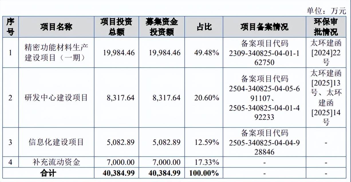 据短平快解读了解,本次IPO,富印新材拟向不特定合格投资者公开发行股票不超过1900万股,拟募集资金40,384.99万元,用于精密功能材料生产建设项目(一期)、研发中心建设项目、信息化建设项目以及补充流动资金,拟使用募集资金分别为19,984.46万元、8,317.64万元、5,082.89万元以及7,000.00万元。