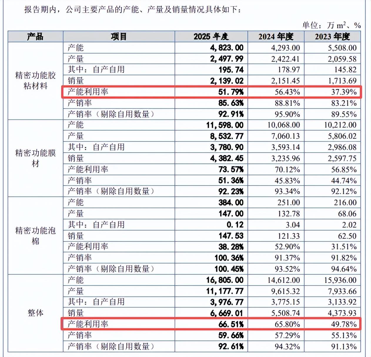 两大产品均属于精密功能胶粘材料,报告期产能利用率并不高,分别为37.39%、56.43%、51.79%,2025年产能高达4,823.00万m2,这种情况下扩大该产品产量是否具备必要性?另外,公司整体产能利用率也不高,分别为49.78%、65.8%、66.51%。
