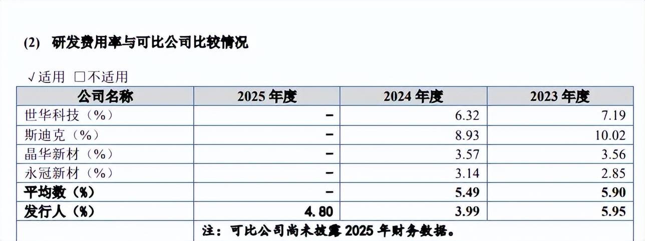 对比行业,可比同行2023年、2024年研发费用率均值分别为5.9%、5.49%,世华科技、斯迪克2024年研发费用率分别为6.32%、8.93%,而晶华新材、永冠新材分别为3.57%、3.14%,公司仍需要进一步强化研发投入。