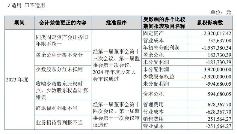 存在多项会计更正。富印新材存在会计差错更正,2023年同类固定资产会计折旧年限不统一、盈余公积计提不充分、少数股东分红未抵销、收购少数股东股权时点,少数股东权益计算错误、辞退福利列报不当、业务招待费列报不当。