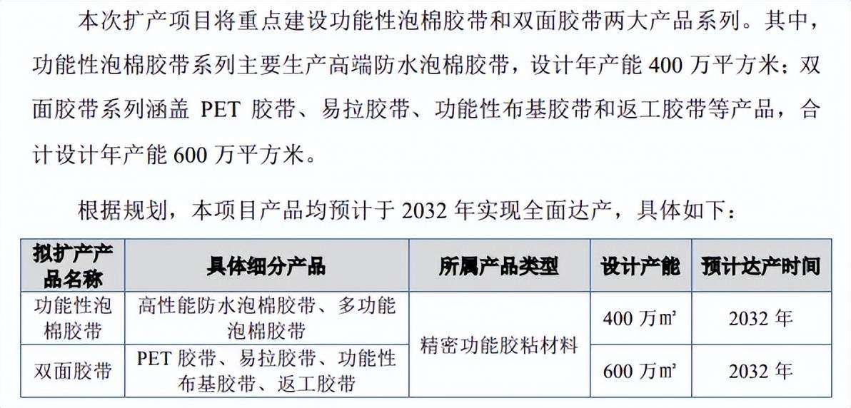 精密功能胶粘材料产能利用率较低,扩产是否存在必要性。富印新材募投的生产项目建成投产后,公司将新增共计1,000万㎡/年的功能性泡棉胶带及双面胶系列产品产能,设计产能分别为400万㎡、600万㎡,建设周期为2年。