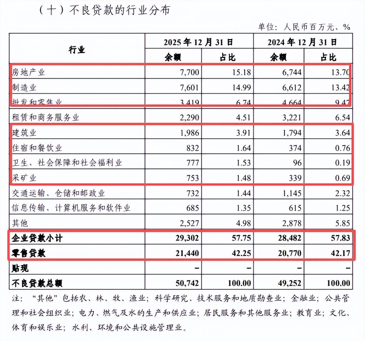 房地产业不良贷款高达77亿元。2025年,光大银行对公不良贷款293.02亿元,同比增加8.2亿元,主要集中在房地产业、制造业、批发和零售业,分别为77亿元、76.01亿元、34.19亿元,前两大行业分别增加9.56亿元、9.89亿元,批发和零售业减少12.45亿元。