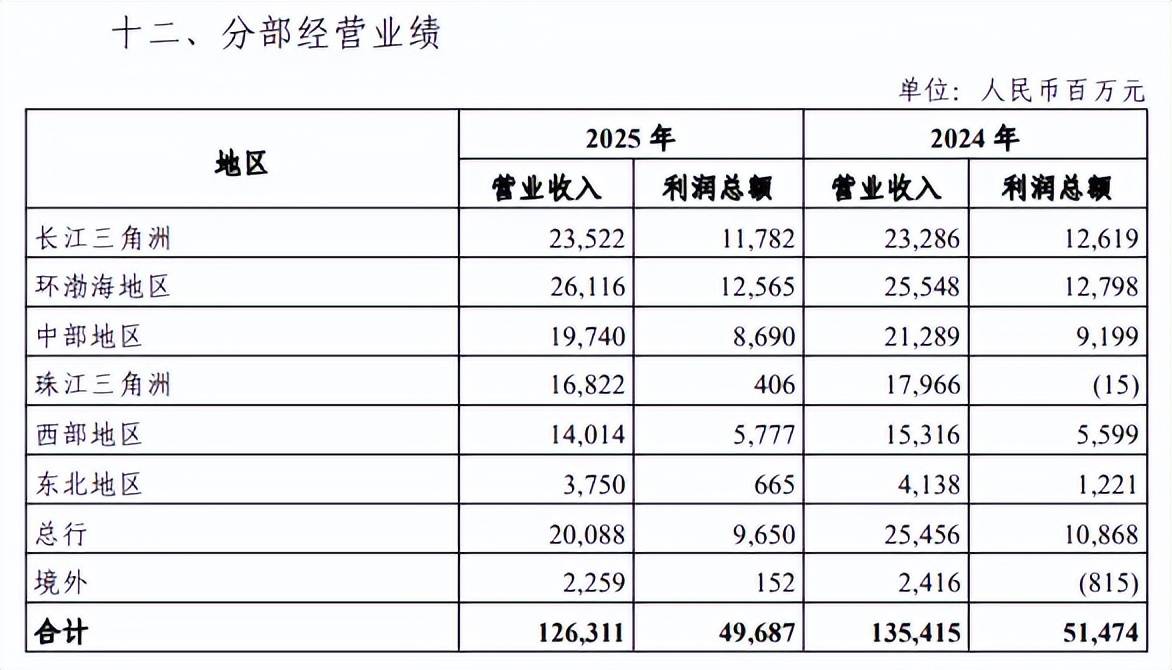 总行收入、净利双降。按分部来看,中部地区、珠江三角洲、西部地区、东北地区、总行、境外收入均出现下滑,金额分别为197.4亿元、168.22亿元、140.14亿元、37.5亿元、200.88亿元、22.59亿元,前三大地区同比分别减少15.49亿元、11.44亿元、13.02亿元,总行收入减少最大,高达53.68亿元,长江三角洲、环渤海地区收入分别增加2.36亿元、5.68亿元至235.22亿元、261.16亿元。