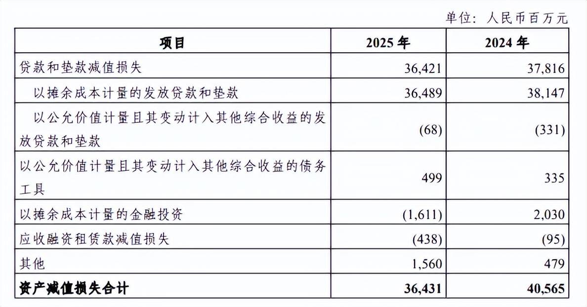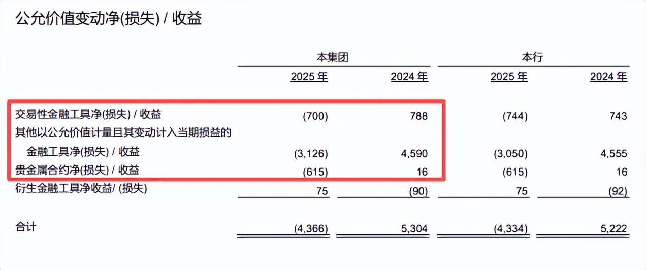 公允价值变动损失是非利息收入转降的关键,2025年损失额高达43.66亿元,而上年同期则收益53.04亿元,交易性金融工具、金融工具、贵金属合约损失额分别为7亿元、31.26亿元、6.15亿元。