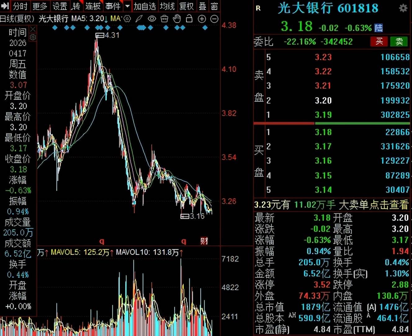 二级市场上,光大银行A股股价在去年7月达到4.31元/股(前复权,下同)的高点后,开始了较长时间的下跌,低点至3.16元/股,截至4月17日收盘,股价为3.1元/股,较高点下跌超26%,总市值1879亿元,TTM市盈率4.84倍。