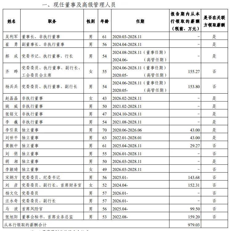 需要指出的是,现任董事及高级管理人员薪酬不降反增,2025年为979.03万元,较2024年757.52万元增加221.51万元,副行长齐晔、杨兵兵、党委委员、纪委书记宋炳方、副行长、首席财务官刘彦、首席风险官马波、董事会秘书、首席业务总监税前薪酬分别为155.27万元、153.8万元、143.68万元、152.31万元、99.5万元、159.2万元。