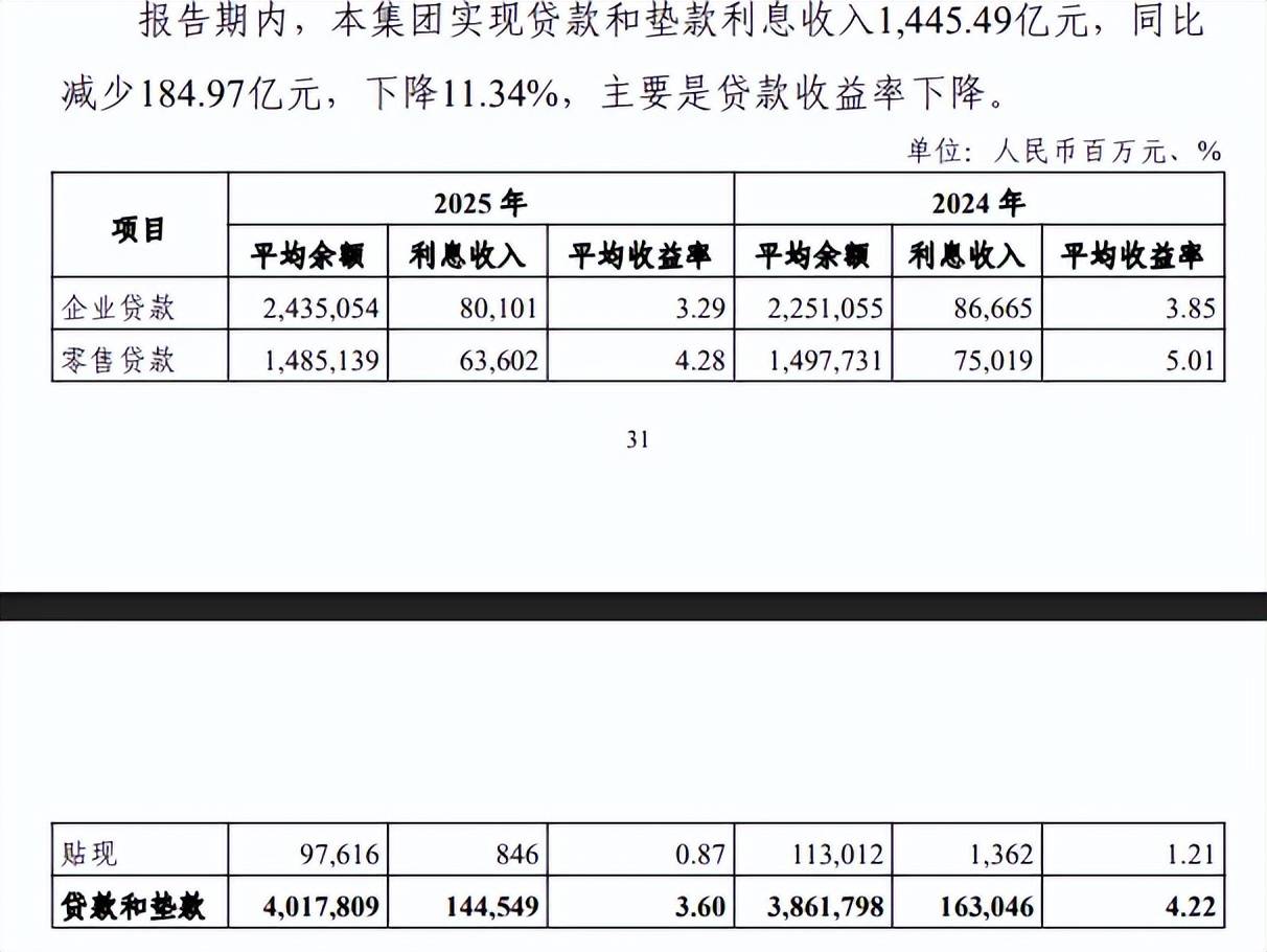 进一步来看,2025年利息收入2111.58亿元,同比减少228.49亿元,降幅9.76%,主要是贷款和垫款利息收入下降,金额为1,445.49亿元,同比减少184.97亿元,下降11.34%,平均收益率3.6%,同比下滑0.62个百分点。