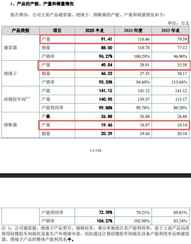 据短平快解读了解,报告期内避雷器、绝缘子、熔断器产量均存在波动,避雷器分别为79.59万支、110.46万支、91.41万支;绝缘子产量分别为33.58万支、28.91万支、49.54万支;熔断器分别为24.14万支、18.87万支、19.46万支,扩产产能分别是2025年产量的17.28%、33.51%、88.9%,结合三大产品产量波动较大,这种情况下扩产是否存在必要性?