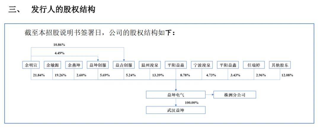 父子三人表决权近55%。益坤电气无控股股东,实际控制人是余燕坤、余明宣、余敏源,三人直接持股比例分别为2.6%、21.84%、19.26%,且且余明宣通过担任益坤创服、益垚创服的执行事务合伙人分别控制5.69%、5.24%的表决权,三人合计控制公司54.63%的股份。