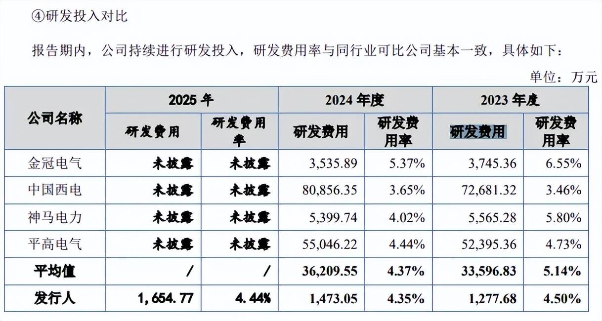 另外,2023年、2024年,可比同行研发费用率均值均超过公司,分别为5.14%、4.37%,进一步来看,金冠电气、平高电气2024年研发费用率均超过公司,分别为5.37%、4.44%,而神马电力、中国西电分别为4.02%、3.65%。