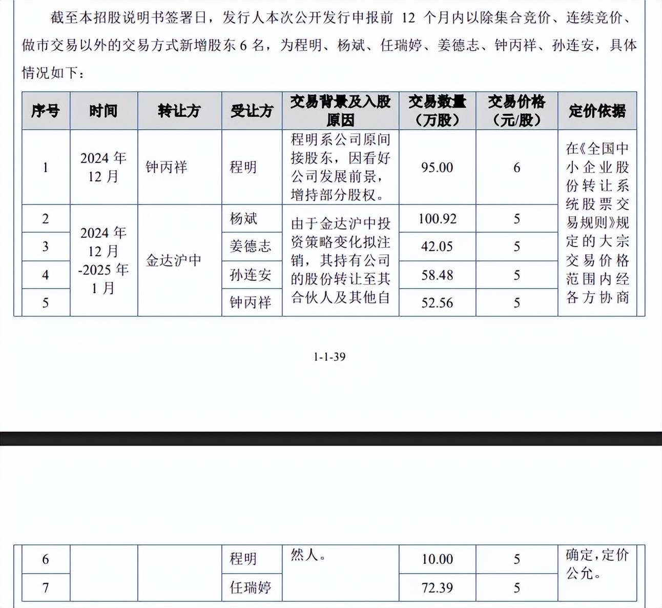 2024年12月至2025年1月,金达沪中分别向杨斌、姜德志、孙连安、钟丙祥、程明、任瑞婷转让100.92万股、42.05万股、58.48万股、52.56万股、20万股、72.39万股,交易价格5元/股(价格与金达沪中2022年12月受让股份价格相同)。