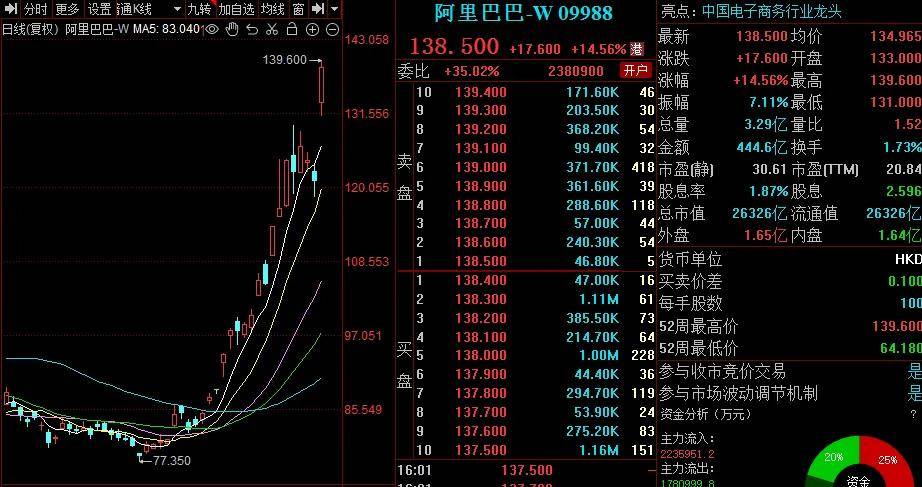 财报发布后,阿里巴巴港美股股价均大涨,截至2月21日收盘,港股股价为138.5港元/股,涨幅14.56%,该股价较1月初低点涨幅近八成,总市值26326亿港元,TTM市盈率20.84。